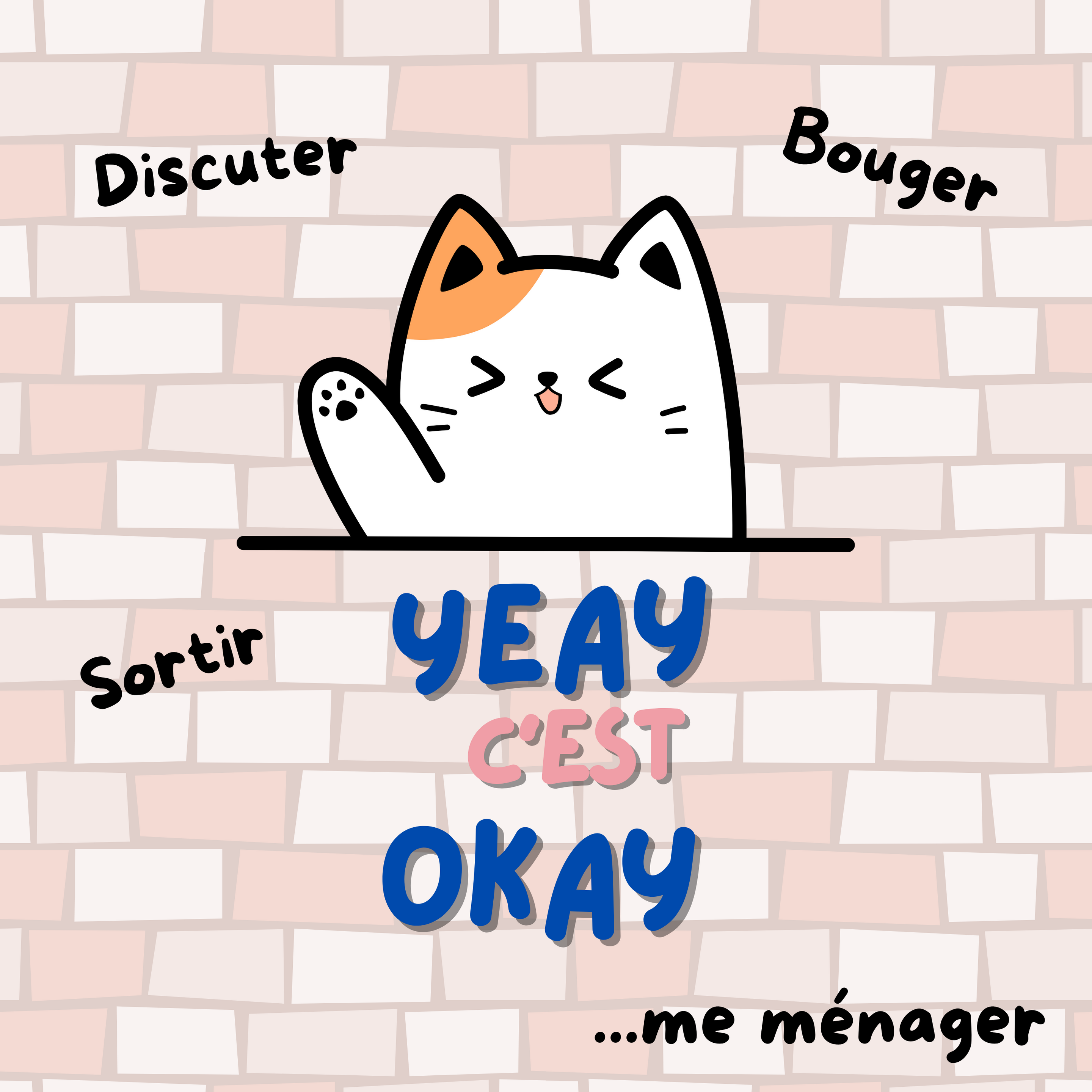 Illustration d'un petit chat qui lรจve la patte l'air content. Lรฉgende Yeay c'est okay. Autour les mots: sortir, bouger, discuter, mais aussi me mรฉnager. Fond en mur de briques roses