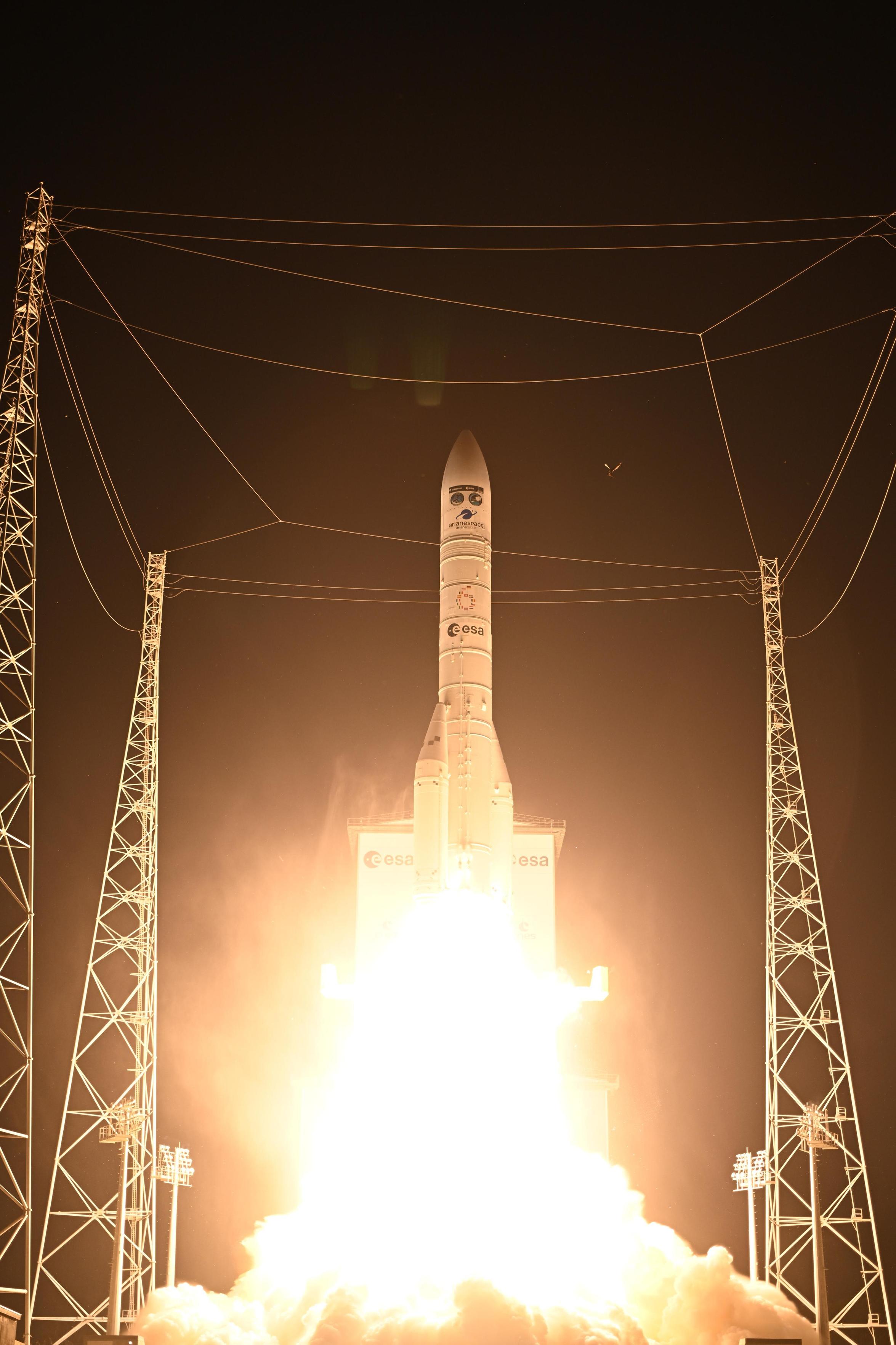 A Vega-C rocket launches at night from the European Space Agencyβs facility, surrounded by tall support towers and cables, with bright flames and smoke erupting from its base as it lifts off.