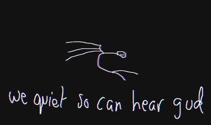 My favorite drawing of the Kali Linux dragon logo, except it's a stick figure with little stick wings, two stick legs, and a smile. Text at the bottom says, "we quiet so can hear gud" The drawing and text is white on a black background.