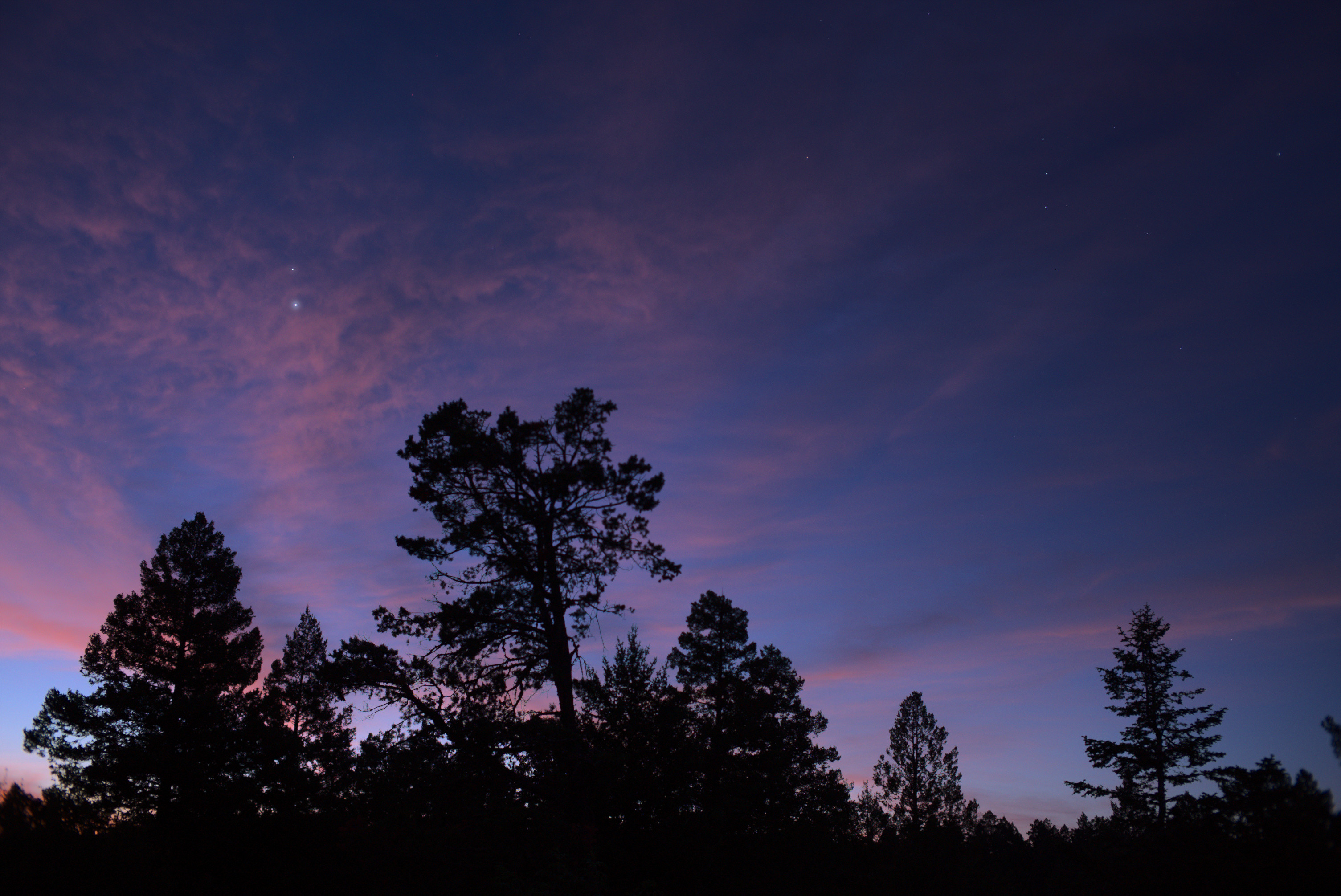 Venus and Jupiter shine through scattered pink clouds in bright morning twilight. Orion is in the right half of the frame. Orion's belt is vertical. Dark trees are silhouettes.