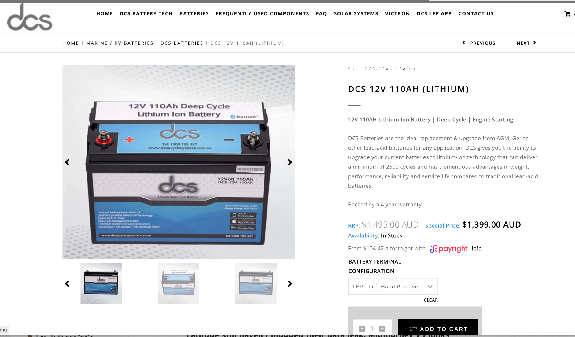 Screenshot of DCS website showing a 12v 110Ah lithium battery for sale.