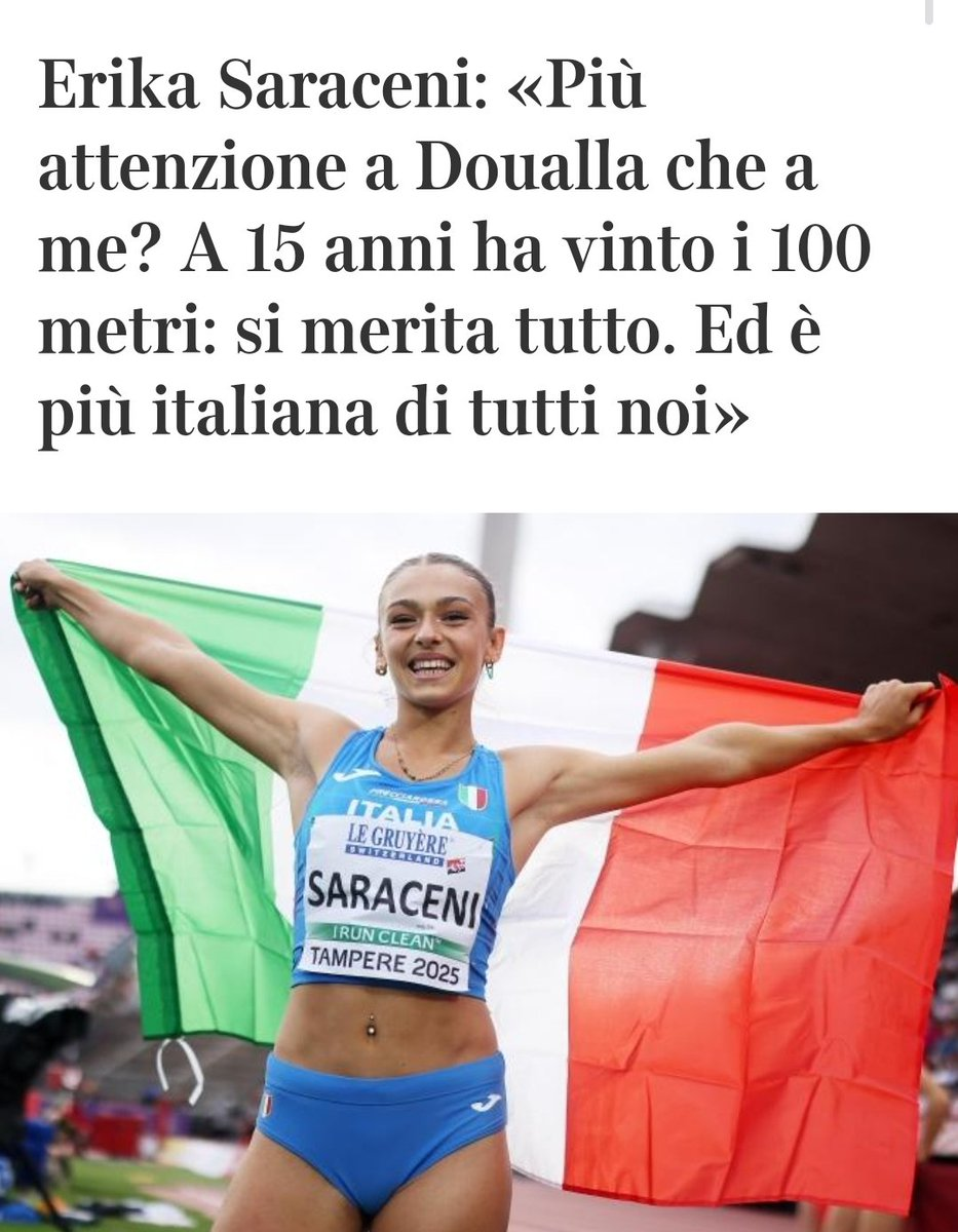 Screenshot del titolo di giornale che dice: Erika Saraceni: "PiΓΉ attenzione a Doualla che a me? A 15 anni ha vinto i 100 metri: simerita tutto. Ed Γ¨ piΓΉ italiana di tutti noi"