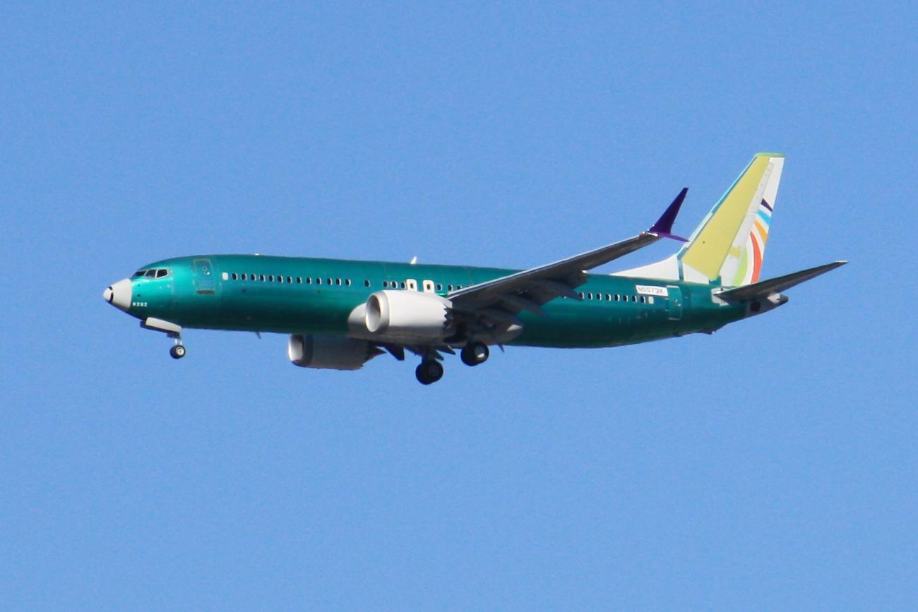 unpainted green Boeing 737 MAX8 with a pre-painted rudder indicating the customer for this aircraft is Arajet of the Dominican Republic The plane was on final approach to Portland International Airport PDX for Runway 28L photo by Ian Kluft August 12, 2025 Portland, Oregon, USA