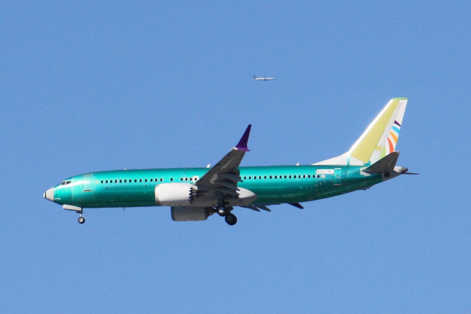 unpainted green Boeing 737 MAX8 with a pre-painted rudder indicating the customer for this aircraft is Arajet of the Dominican Republic The plane was on final approach to Portland International Airport PDX for Runway 28L In the far background a Delta Airlines Boeing 737 can be seen going the opposite direction (left to right, eastbound) in a position where it may have been also inbound to Portland heading parallel to the approach course until there's a gap in the traffic and Air Traffic Control instructs them to make a right turn to final approach. photo by Ian Kluft August 12, 2025 Portland, Oregon, USA