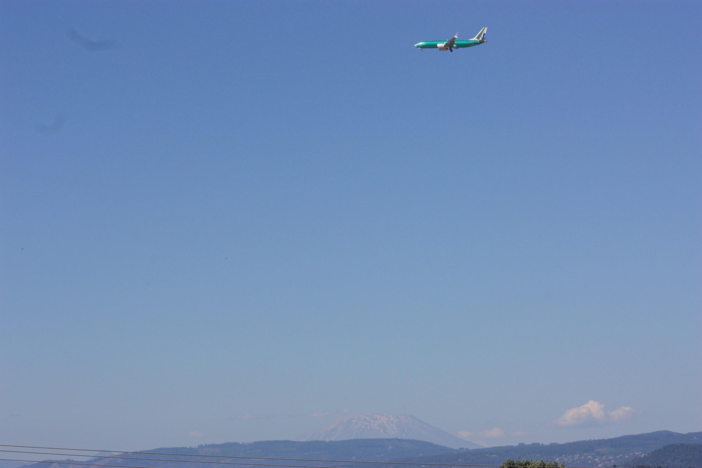 A brand new green unpainted Boeing 737 MAX8 on final approach to Portland Int'l Airport PDX for painting. It flew in from the Boeing 737 factory in Renton, Washington, probably on this plane's first flight. The pre-painted rudder indicates this aircraft will go to SCAT Airlines of Kazakhstan. Mount St Helens is 50 miles / 80 km in the background. photo by Ian Kluft July 28, 2025 Portland, Oregon, USA