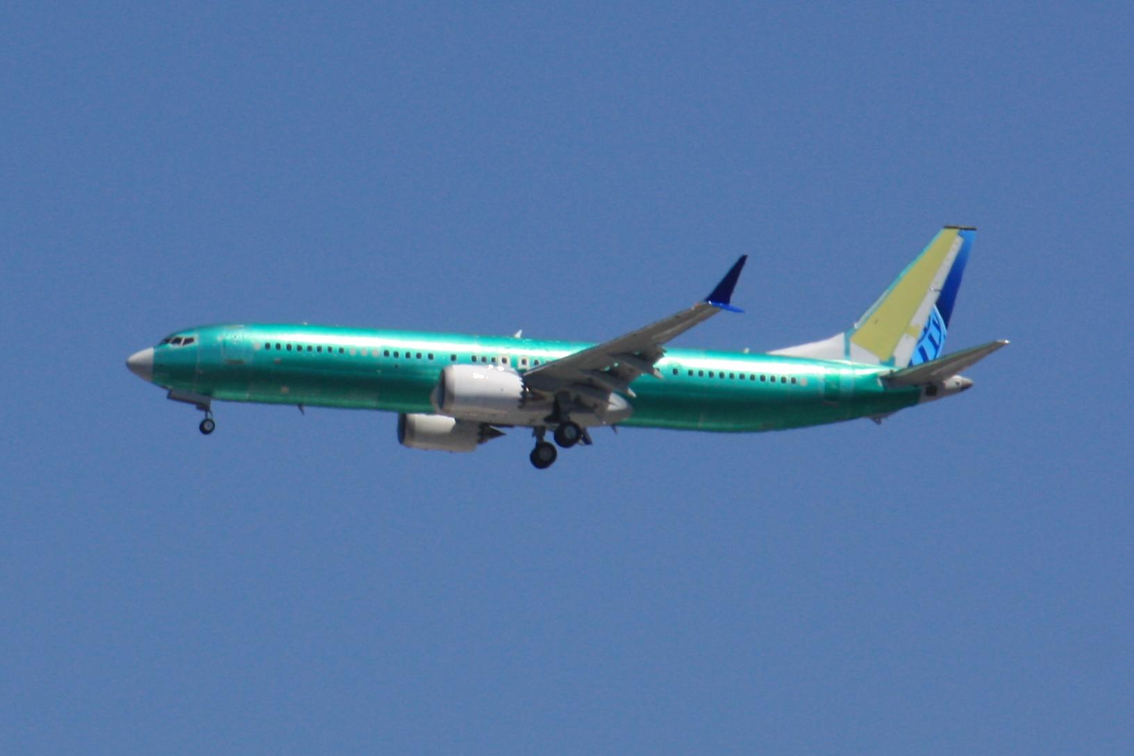 Boeing 737 Max9 on final approach to Portland Int'l Airport PDX. The plane is unpainted, covered in a green vinyl protective coating which will be removed at the paint hangar. The pre-painted rudder and winglets indicate this aircraft's customer is United Airlines. Photo taken from my backyard with optical zoom at a distance of about 1 mile. The only processing was to crop the photo. photo by Ian Kluft July 22, 2025 Portland, Oregon, USA