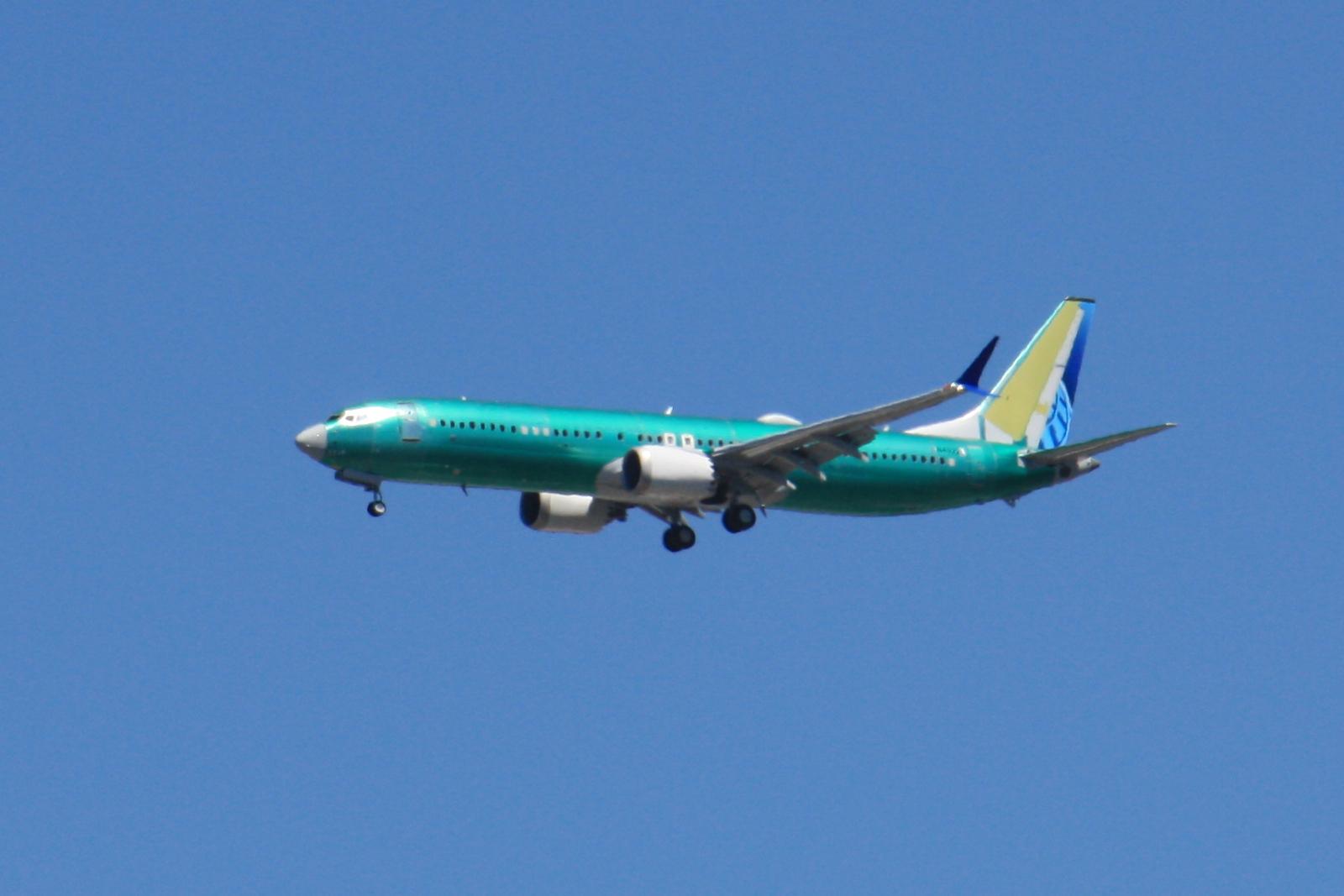 close-up cropped view of unpainted green Boeing 737 MAX9 with pre-painted rudder indicating it will be going to United Airlines photo by Ian Kluft July 12, 2025 Portland, Oregon, USA