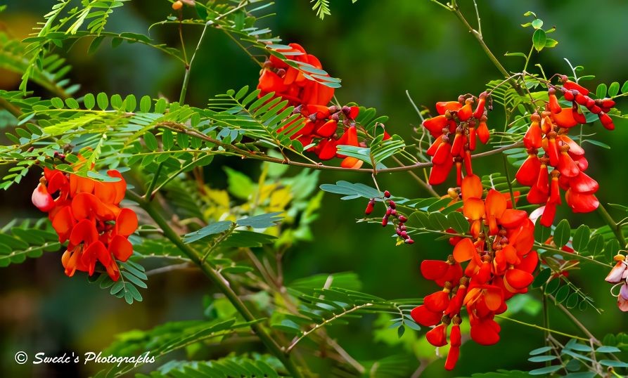 Colorful Crotalaria Display "This image showcases a rattlebox plant (Crotalaria), its blossoms glowing in rich red-orange hues. The flowers hang in loose clusters from slender green stems, each bloom shaped like a narrow tube with a gentle curveโsome fully open, others still in bud. Their color is intense and fiery, like embers suspended in air. Surrounding the blossoms are delicate, feathery green leaves that soften the scene and add texture, their fine structure contrasting with the boldness of the flowers. The background is a gentle blur of green foliage, creating a sense of depth and calm while allowing the rattlebox to stand out in vivid detail. The composition feels balanced and alive, with the plantโs natural elegance captured in a moment of quiet brilliance. A small signature, โSwedeโs Photographs,โ rests in the bottom left corner, marking the image with a personal touch." - Copilot