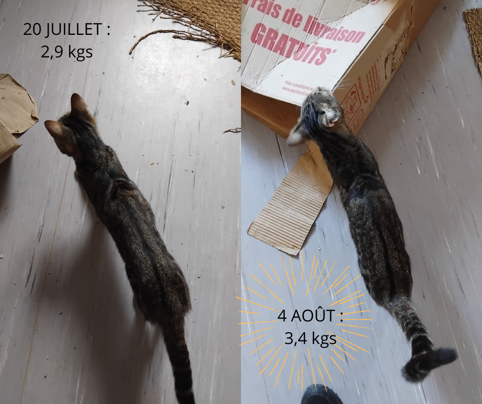 deux photos côte à côte montrant Willow vu de haut. sur la première photo, datant du 20 juillet, il pesait 2.9kgs, et était maigre, les flancs creusés, les côtes et les hanches saillantes. Sur la deuxième photo, datant de ce matin, son abdomen fait enfin la même largeur que ses côtes, et on ne voit plus autant ses côtes et ses hanches. Il est encore assez mince, mais il n'est plus maigre.