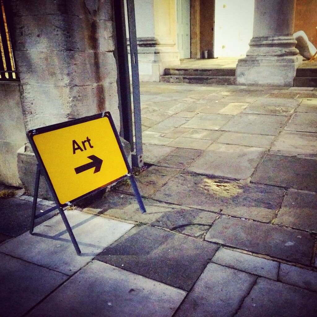 Un panneau de signalisation où est inscrit "art", avec une flèche directionnelle, posé sur le sol, à l'entrée d'une cour
