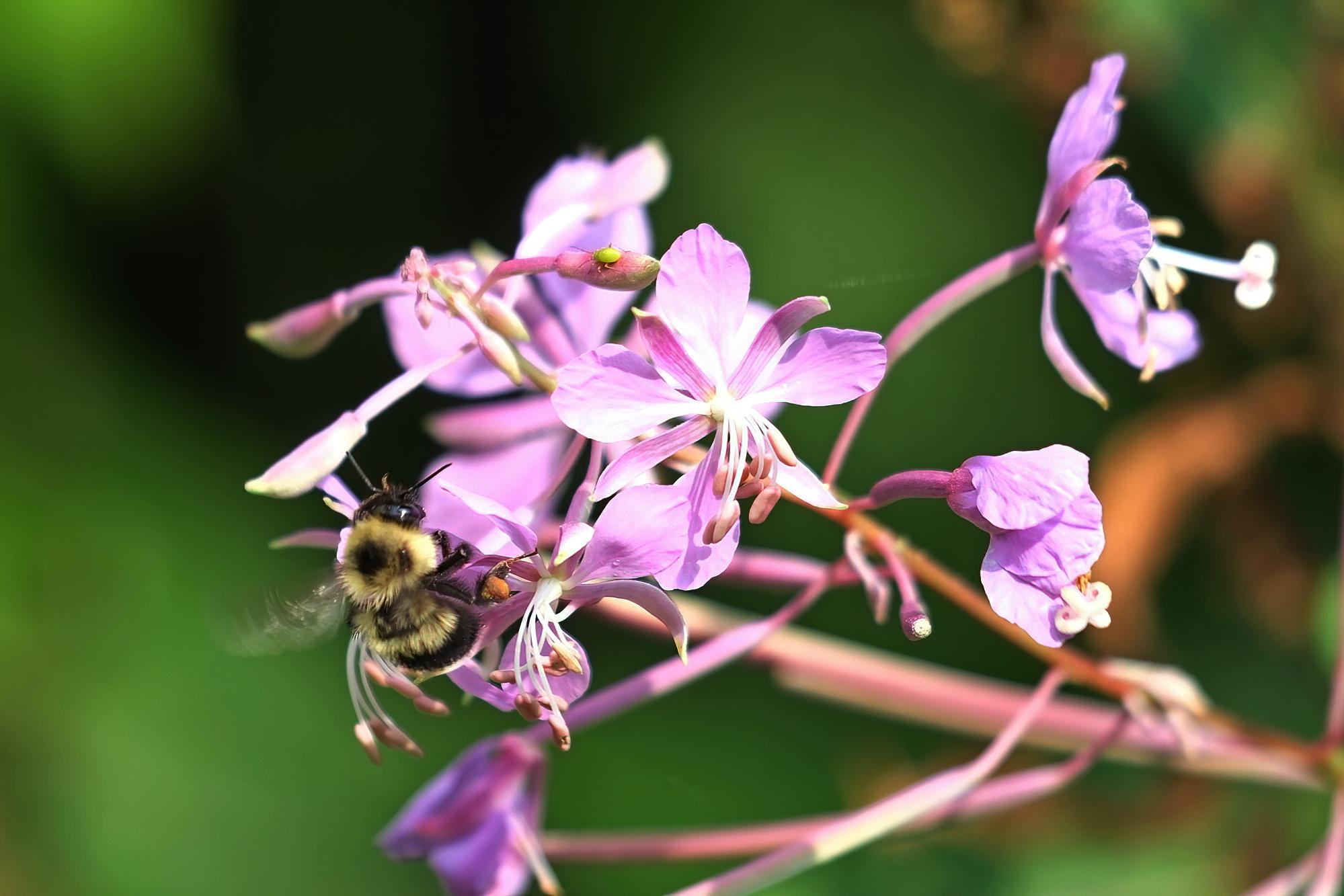 Closeup of a cluster of pink flowers. A furry yellow and black bumble bee is feeding on one of the flowers. A tiny green bug is crawling across a pink petal toward the back. The background is blurry green.