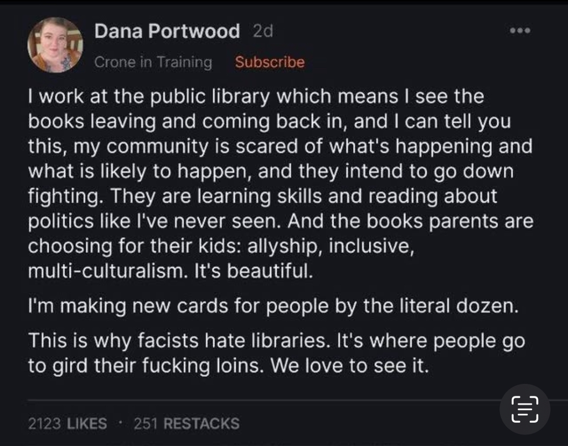 Dana Portwood Crone in Training Subscribe | work at the public library which means | see the books leaving and coming back in, and | can tell you this, my community is scared of what's happening and what is likely to happen, and they intend to go down fighting. They are learning skills and reading about politics like I've never seen. And the books parents are choosing for their kids: allyship, inclusive, multi-culturalism. It's beautiful. I'm making new cards for people by the literal dozen. This is why facists hate libraries. It's where people go to gird their fucking loins. We love to see it.