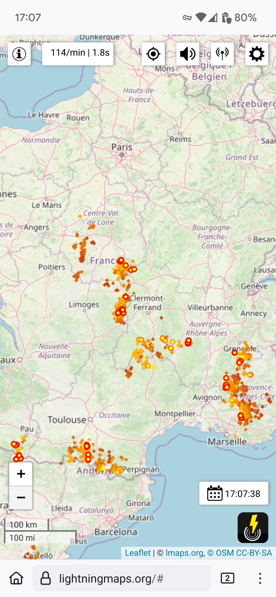 Lightningmaps.org screenshot with a nice thunderstorm plonked over the middle of France