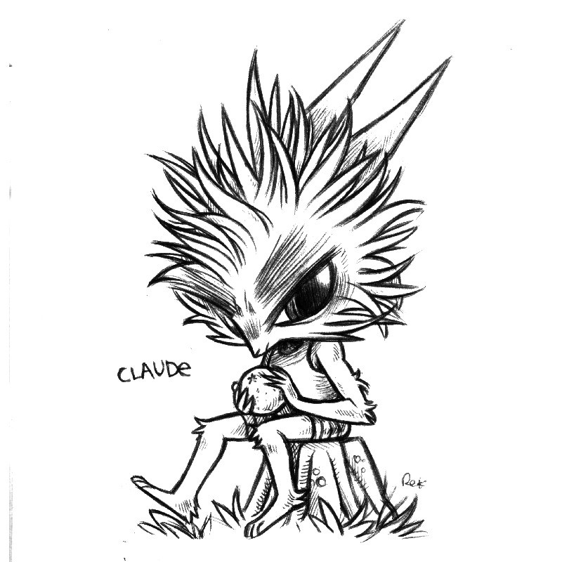 A drawing of a very disheveled, skinny, humanoid rabbit named Claude, the hair on their head is so wild and big that it almost conceals all of their ears. Theyβre holding an orange while sitting on a rock.