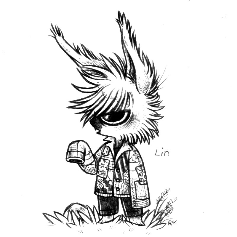 A drawing of a humanoid rabbit named Lin. Lin has long bangs that drape over the front of their face, their fur is long and dishevelled. Their snout is black. They are wearing a long-sleeved blouse that is covered in patches with different patterns, and black pants.