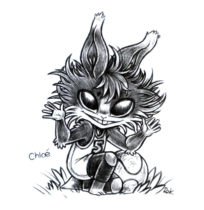 a humanoid rabbit with dark fur, white in the snout and lower face/hands. They are wearing sports clothes and they have very dishevelled fur. They are kneeling on one knee, grinning, hands open towards the viewer with a basketball beside them.