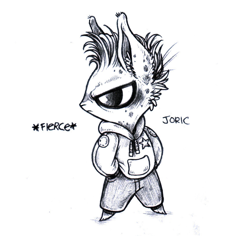 A drawing of a short anthropomorphic rabbit named Joric. Joric has a short mohawk like hairdo, is wearing a sweater with patches on the shoulders and chest, and baggy pants. Joric is frowning, looking away from you. The word "*fierce*" is written next to them.