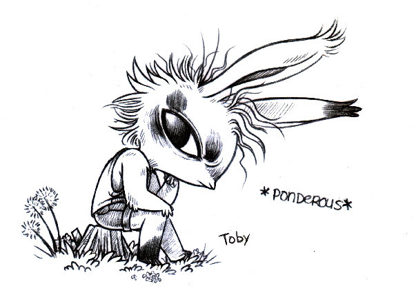 A disshevelled rabbit with long tufted ears named Toby is sitting on a cut log, head leaning on their fist. Toby looks a bit annoyed, but also somewhat ponderous. Their fur has occasional blotches of black.