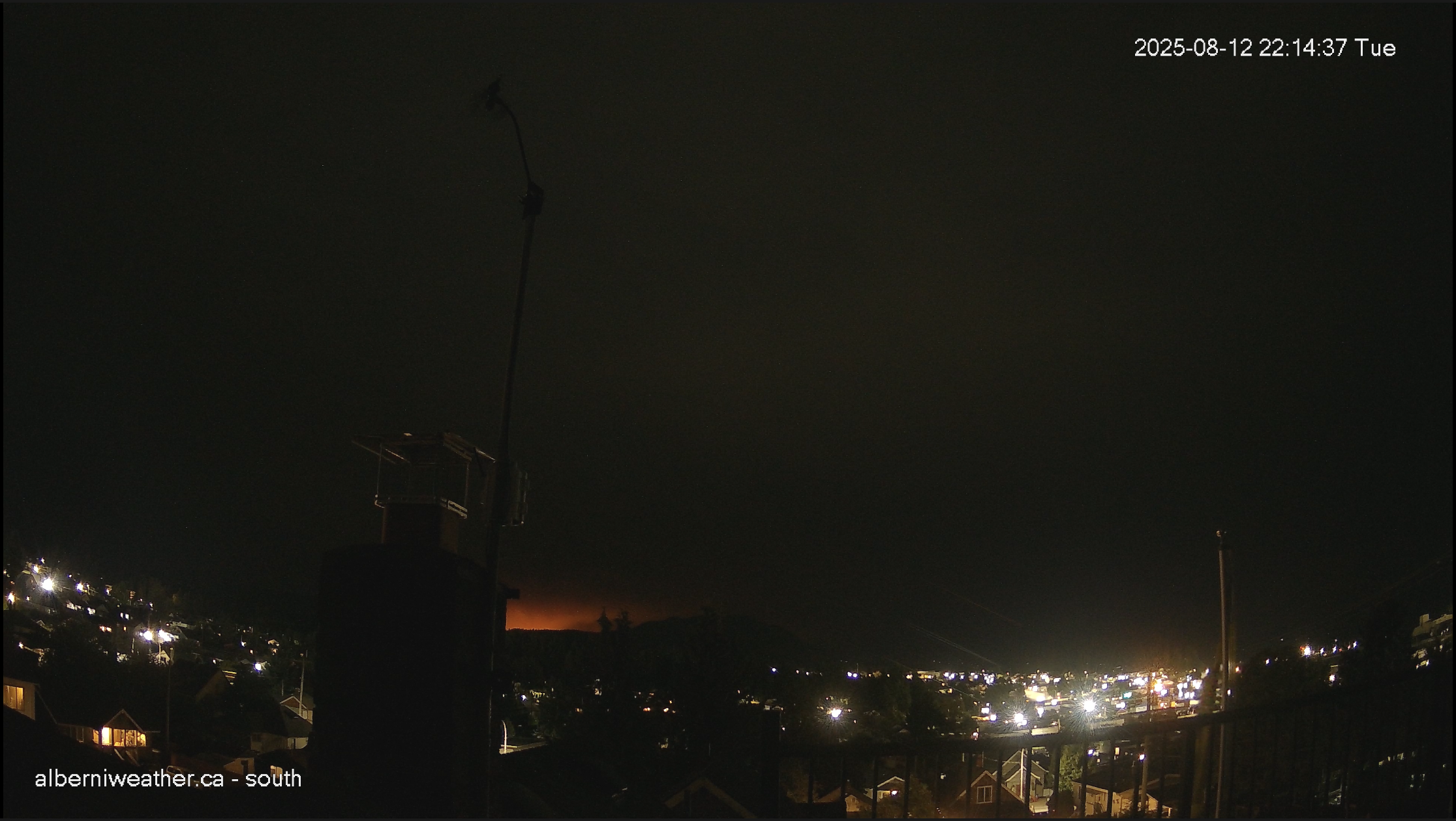 A red glow of the fire in the distance as the night is black and lights of the city are bright white.