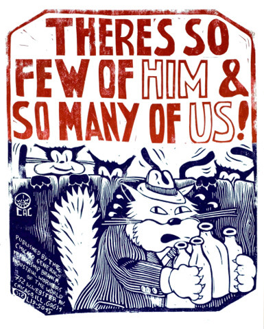 Poster by Carlos Cortez, showing a rich boss, depicted as a shady-looking cat, making off with all the milk, while other cats peer over a fence at him. Title reads: There's so few of HIM and so many of US! IWW logo on the side