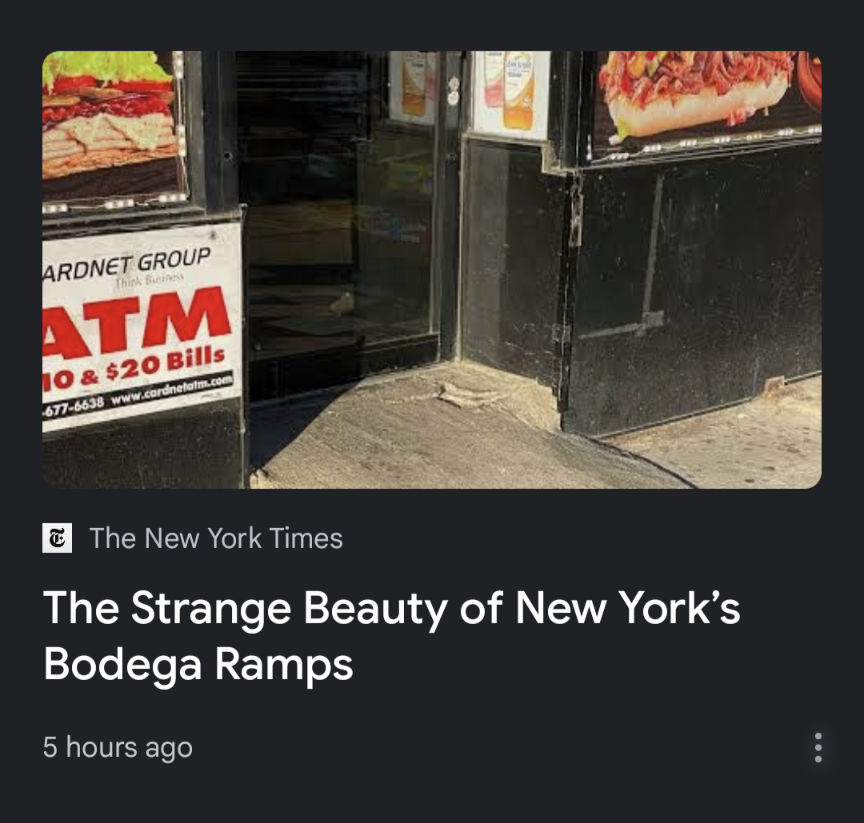 A link to a New York Times story headlined "The Strange Beauty of New York's Bodega Ramps," illustrated by a photo of the front door of a bodega (we don't have those here of course so I'm just assuming) with a sloppily poured concrete "ramp" leading to it