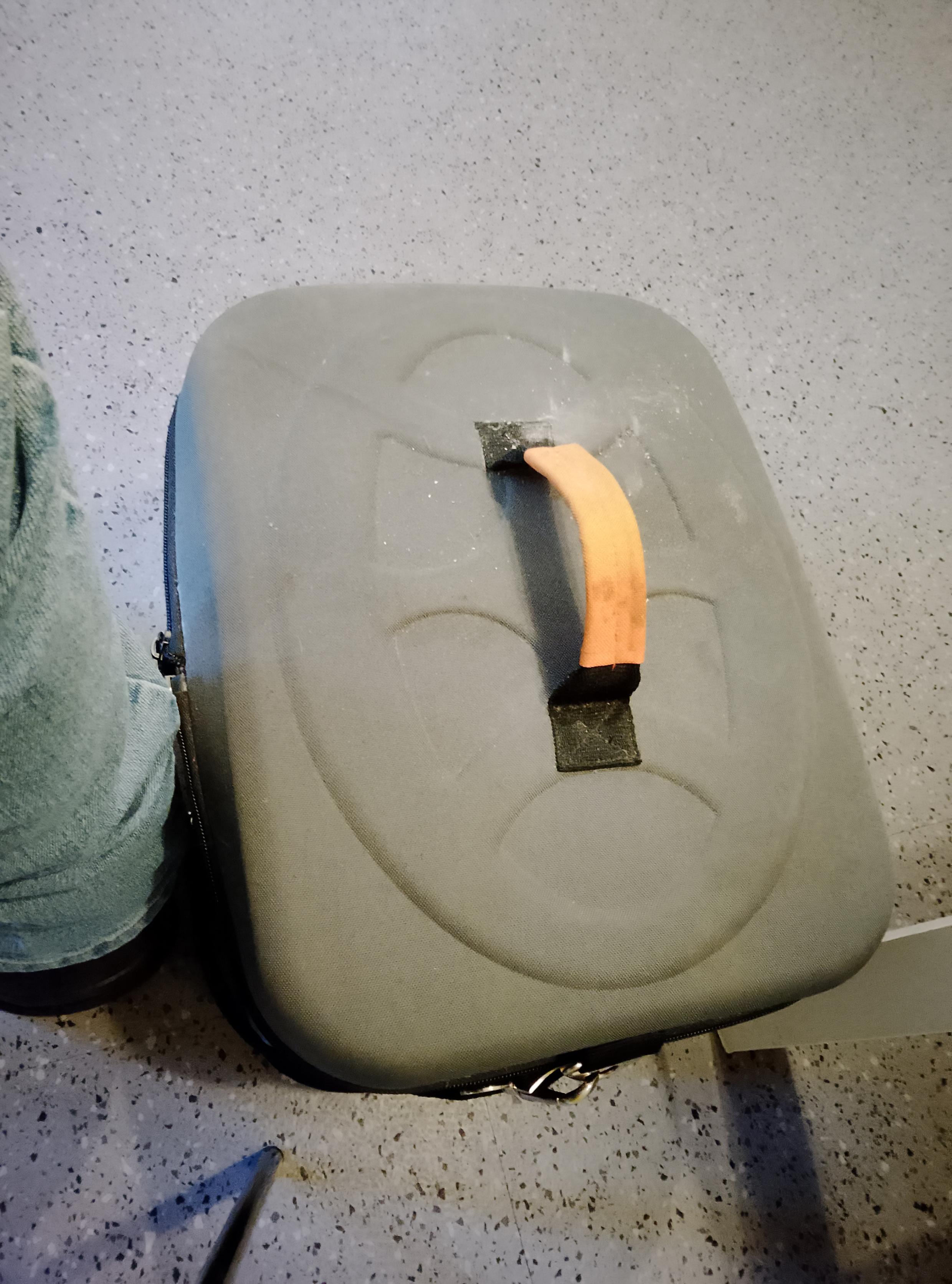 A pet carrier at my feet contains a fat, annoyed, and complaining one-eyed cat.