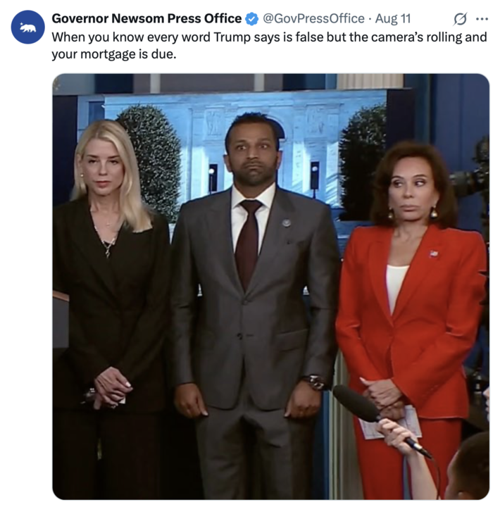 A screenshot of an X post by Governor Newsom Press Office (@GovPressOffice ) from August 11, featuring a sarcastic caption: "When you know every word Trump says is false but the camera's rolling and your mortgage is due." The post includes a still image from a press conference with three individuals standing at a podium. The person in the center is wearing a dark suit and red tie, flanked by a woman in a dark suit on the left and a woman in a bright red suit on the right. The background shows a blurred image of the White House. The post includes a verification badge and a California state bear logo.