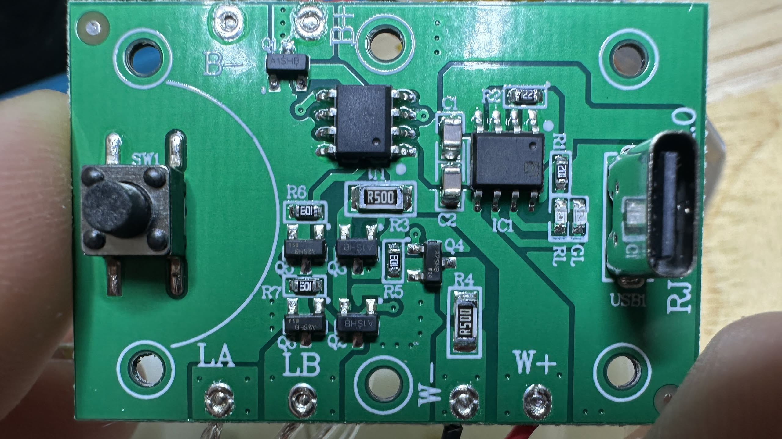 circuit board with two ICs that have their labels removed. one is a battery management and the other in an unknown SOIC-8 chip. a large R500 is in the center of the board.