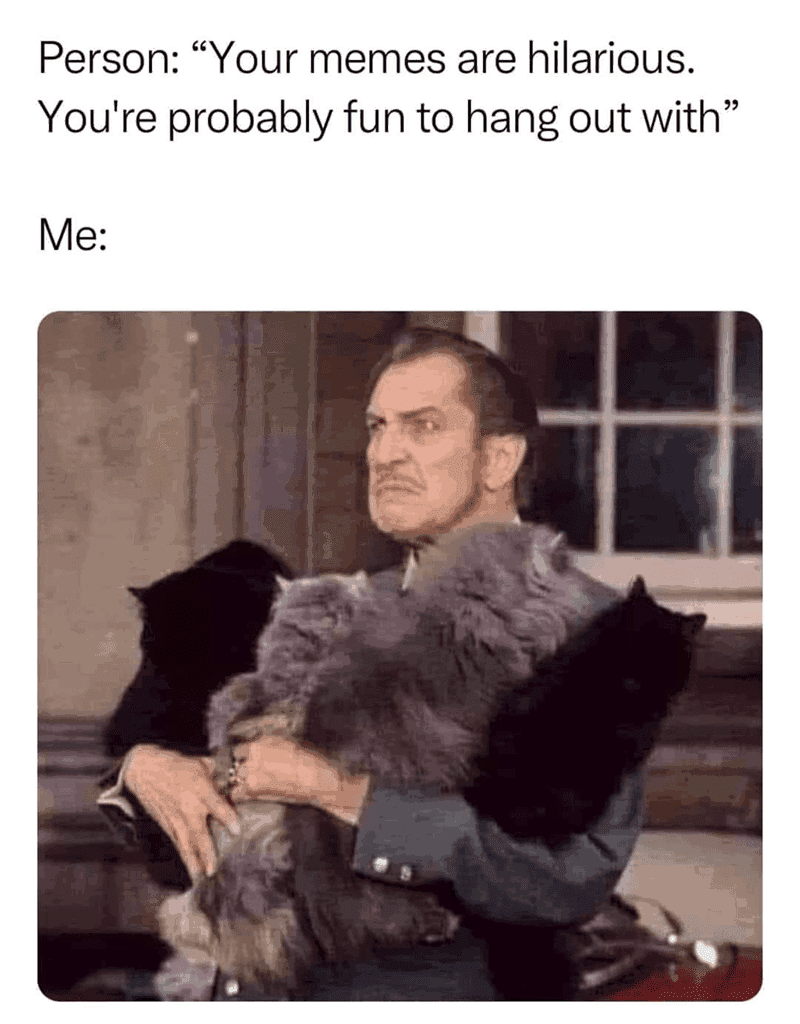 "Your memes are hilarious, you're probably fun to hang out with" Photo of Vincent Price, a distinguished looking gentleman with a mustache, holding four cats in his arms and looking extremely grumpy