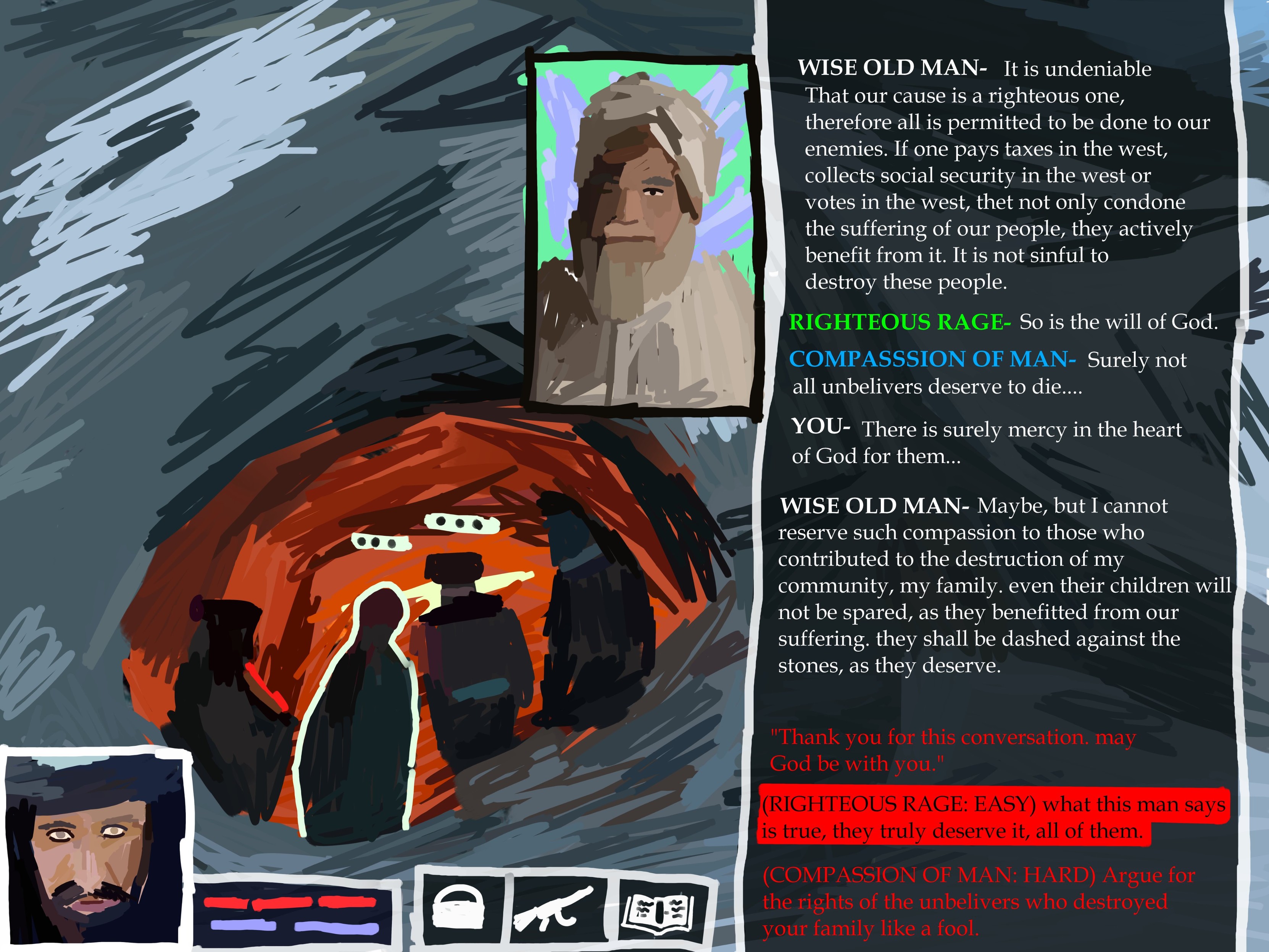 WISE OLD MAN- It is undeniable That our cause is a righteous one, therefore all is permitted to be done to our enemies. If one pays taxes in the west, collects social security in the west or votes in the west, thet not only condone the suffering of our people, they actively benefit from it. It is not sinful to destroy these people. RIGHTEOUS RAGE- So is the will of God. COMPASSSION OF MAN- Surely not all unbelivers deserve to die.... YOU- There is surely mercy in the heart of God for them... WISE OLD MAN- Maybe, but I cannot reserve such compassion to those who contributed to the destruction of my community, my family. even their children will not be spared, as they benefitted from our suffering. they shall be dashed against the stones, as they deserve. "Thank you for this conversation, may God be with you." (RIGHTEOUS RAGE: EASY) what this man says is true, they truly deserve it, all of them. (COMPASSION OF MAN: HARD) Argue for the rights of the unbelivers who destroyed your family like a fool.