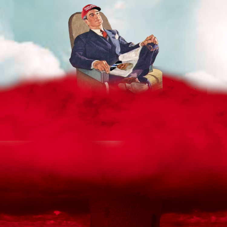 A red, angry mushroom cloud. Sitting atop it, surrounded by blue skies and fluffy clouds, is a smirking business-suited man reclining in an armchair. He wears a MAGA hat and reads a magazine turned to a page showing Donald Trump's face.