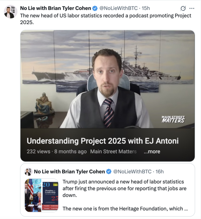 A screenshot of two X posts by No Lie with Brian Tyler Cohen (@NoLieWithBTC ). The first post, 15 hours ago, states, "The new head of US labor statistics recorded a podcast promoting Project 2025," with a thumbnail of a video titled "Understanding Project 2025 with EJ Antoni" from Main Street Matters, showing a man in a suit and tie with a background of a naval painting, recorded 8 months ago with 232 views. The second post, 16 hours ago, reads, "Trump just announced a new head of labor statistics after firing the previous one for reporting that jobs are down. The new one is from the Heritage Foundation, which ... ," accompanied by an image of a book titled "Mandate for Leadership 2025" with a photo of Donald Trump.