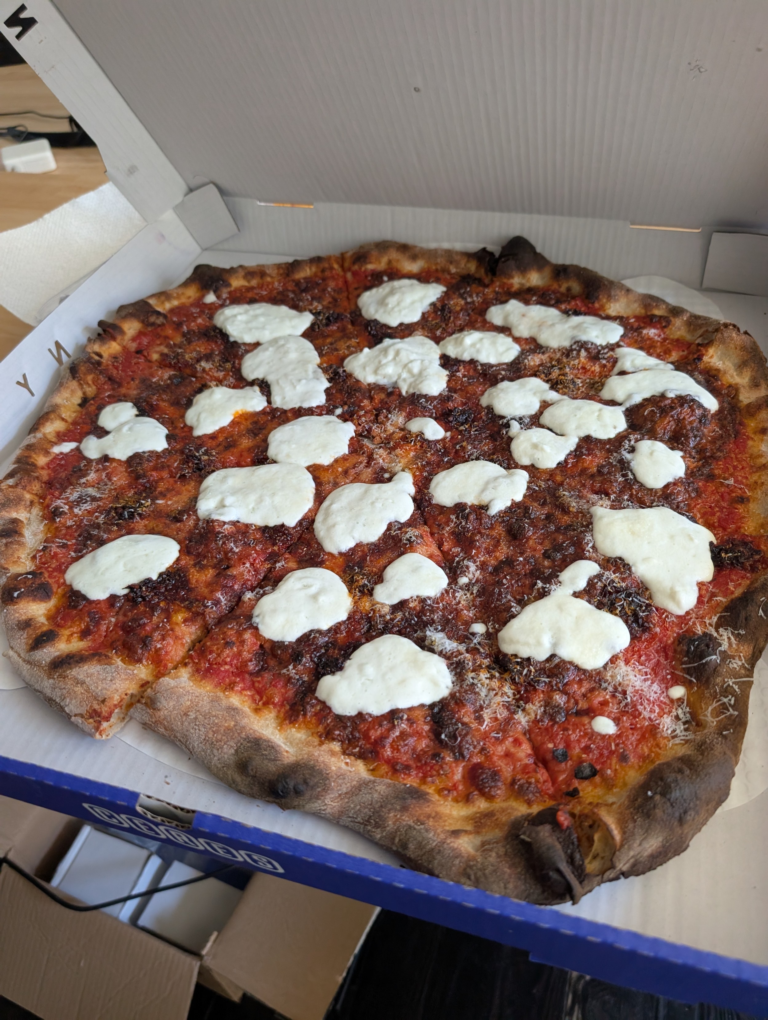 A pizza with dnuja salami, burrata, and balsamic The crust is like foccacia and the tomato is very sweet. In addition they pay particular care to prevent steamage