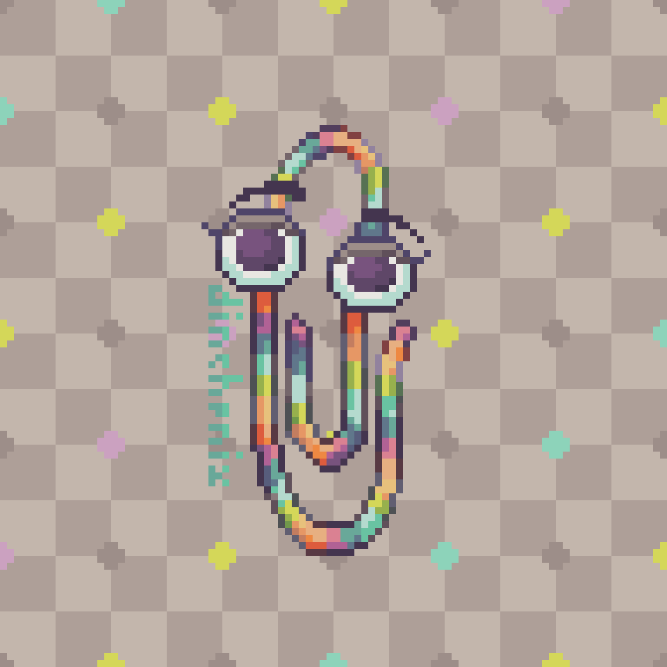 pixel art showing Clippy in rainbow colors with grey checkered background