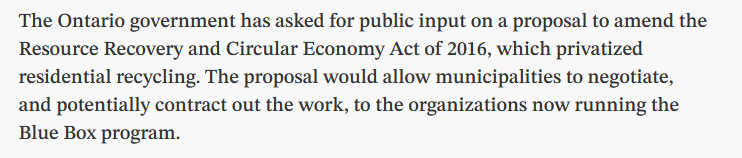 Excerpt from the linked article reading: The Ontario government has asked for public input on a proposal to amend the Resource Recovery and Circular Economy Act of 2016, which privatized residential recycling. The proposal would allow municipalities to negotiate, and potentially contract out the work, to the organizations now running the Blue Box program.