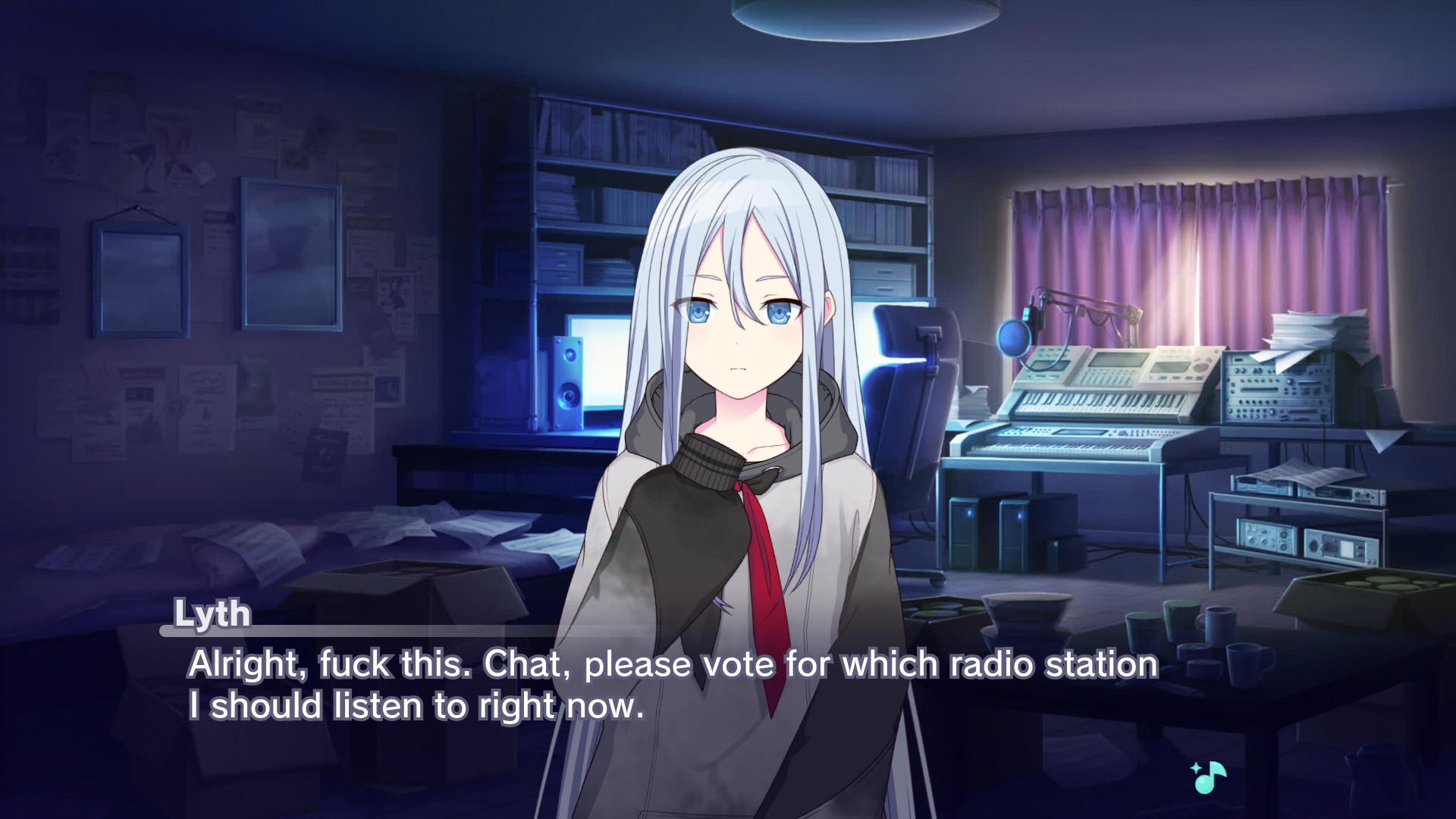 Project Sekai custom scene of Lyth in an approximation of her room saying "Alright, fuck this. Chat, please vote for which radio station I should listen to right now."