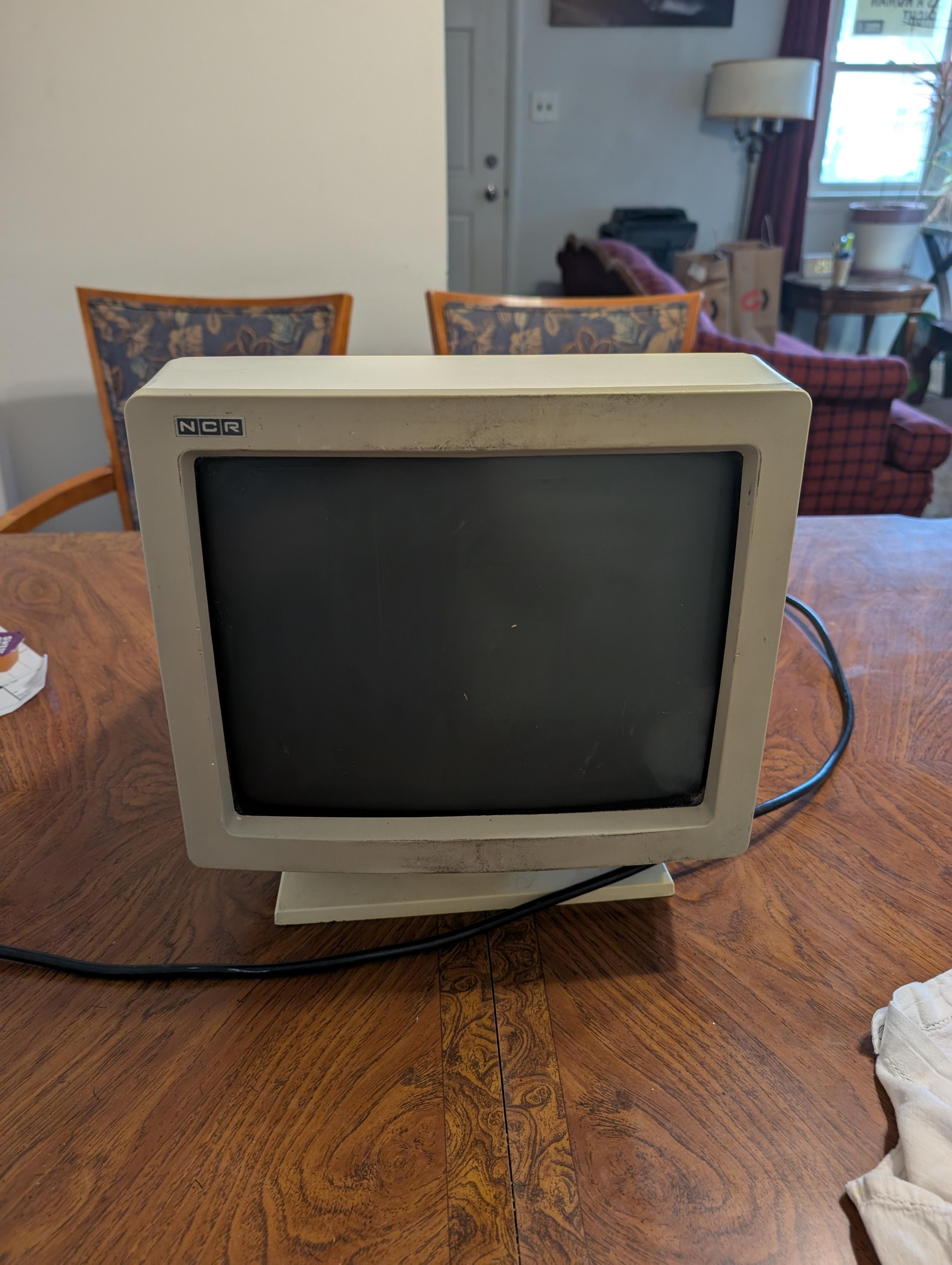 An old CRT monitor emblazoned with the NCR logo in the top left. It's about a 12" sized display in a yellowed beige case.