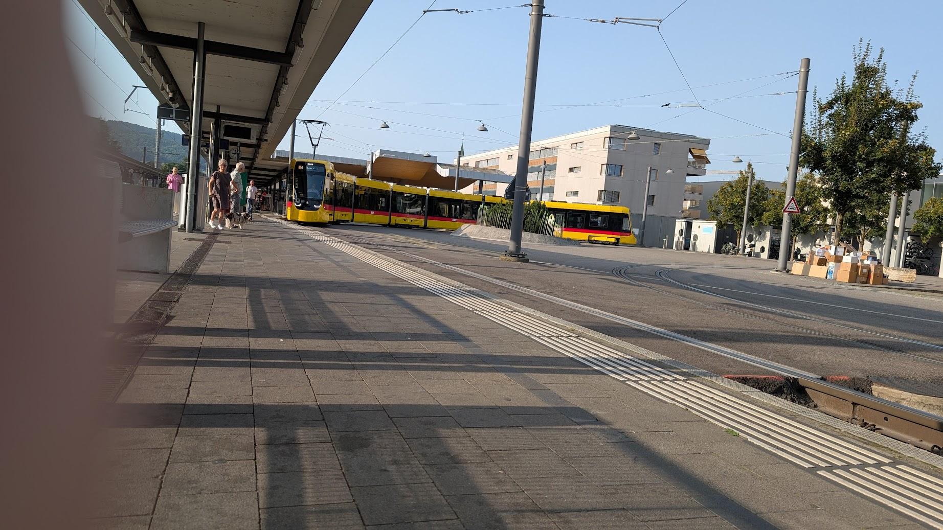 Photo of a yellow BLT tram, turning back towards Basel at Arlesheim/Dornach this morning.The sky is blue, there are buildings behind the tram.