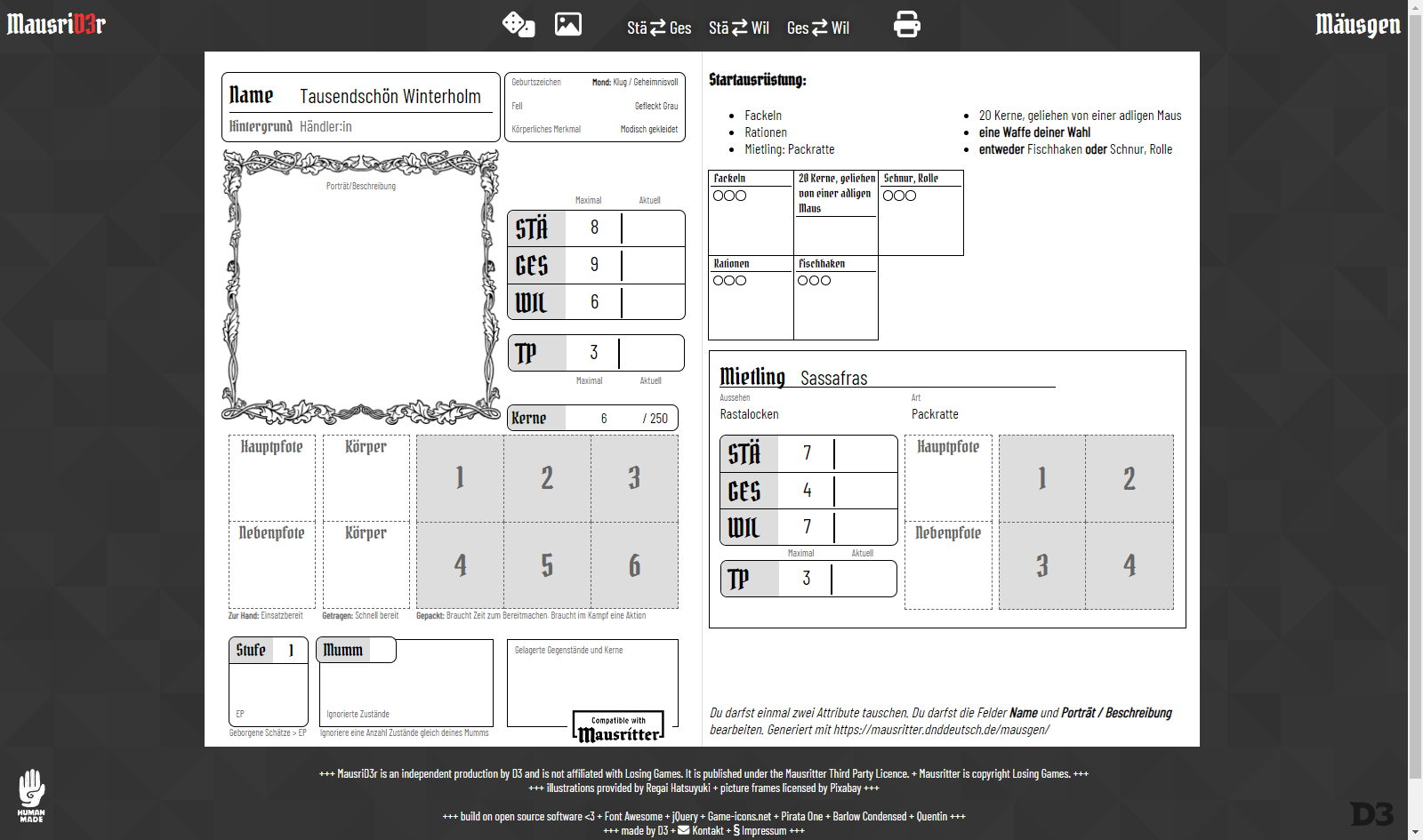 Screenshot von "Mäusgen". Links ein ausgefüllter Mausritter Charakterbogen, Rechts eine Auflistung der Startausrüstung inklusive Ausrüstungskärtchen und Wertebogen eines Mietlings
