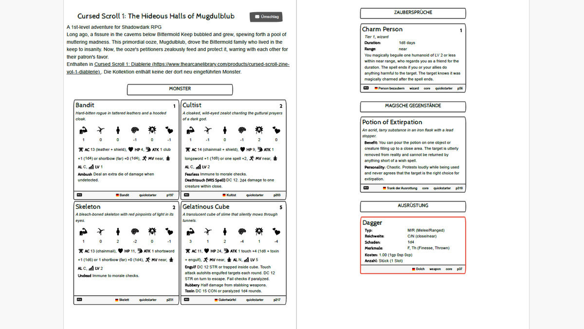 Eine Druckvorschau des Abenteuers "The Hideous Halls of Mugdulblub". Der Ausdruck enthält die Kurzbeschreibung des Abenteuers, vier Monsterwerteblöcke, einen Zauberspruch, einen Magischen Gegenstand und einen Ausrüstungsgegenstand.