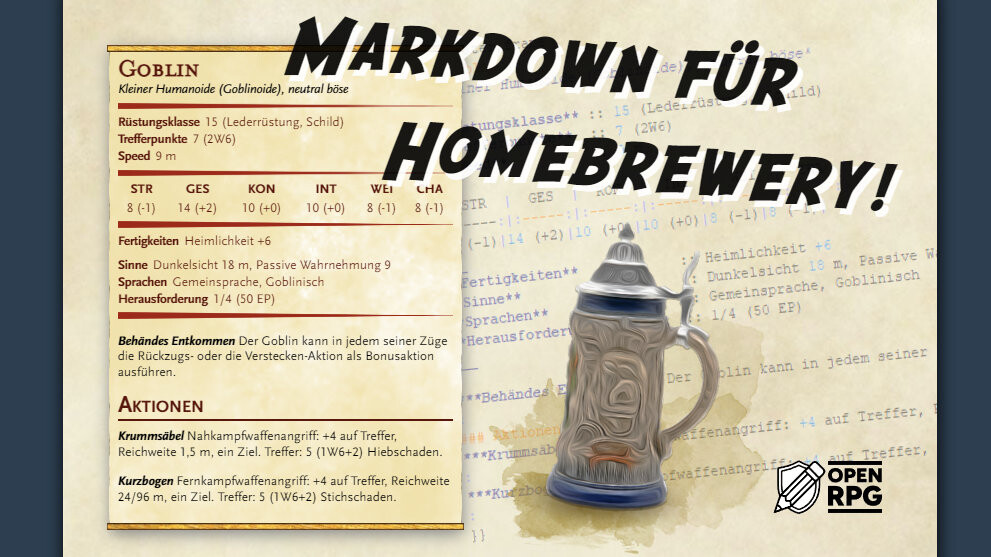 "Markdown fรผr Homebrewery" Links ein Screenshot eines in Homebrewery erzeugten Werteblocks fรผr den Goblin. Rechts im Hintergrund das zugehรถrige Markdown, davor der Homebrewery Humpen und das OpenRPG.de-Logo