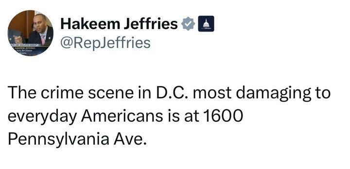 A screenshot of an X post by Hakeem Jeffries (@RepJeffries ) stating: "The crime scene in D.C. most damaging to everyday Americans is at 1600 Pennsylvania Ave." The post includes a profile picture of a man in a suit and tie, with a verification badge and a congressional emblem.