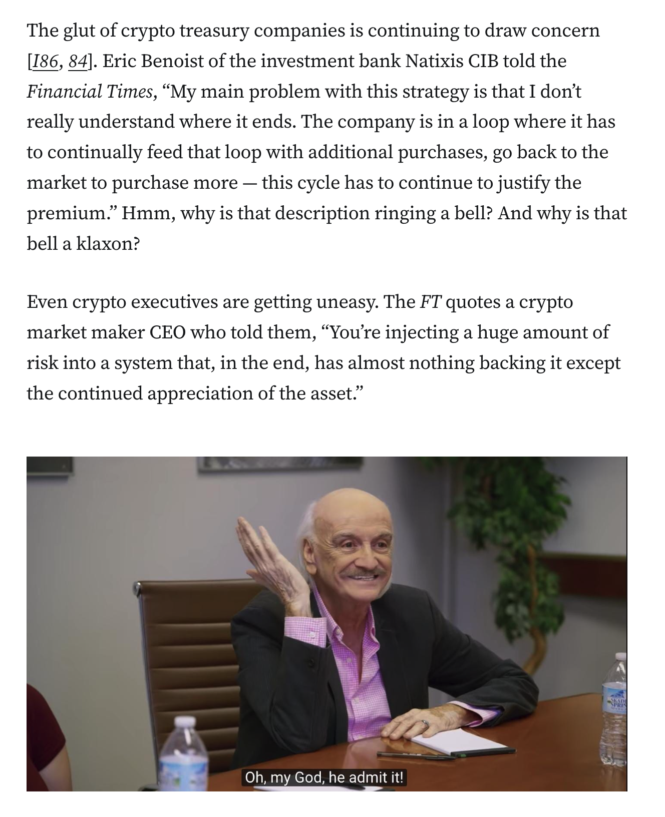 The glut of crypto treasury companies is continuing to draw concern [I86, 84]. Eric Benoist of the investment bank Natixis CIB told the Financial Times, βMy main problem with this strategy is that I donβt really understand where it ends. The company is in a loop where it has to continually feed that loop with additional purchases, go back to the market to purchase more β this cycle has to continue to justify the premium.β Hmm, why is that description ringing a bell? And why is that bell a klaxon? Even crypto executives are getting uneasy. The FT quotes a crypto market maker CEO who told them, βYouβre injecting a huge amount of risk into a system that, in the end, has almost nothing backing it except the continued appreciation of the asset.β Screenshot of I Think You Should Leave episode, where the focus group man states βOh my God, he admit it!β
