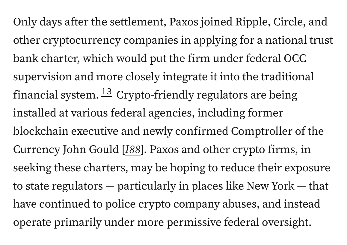 Only days after the settlement, Paxos joined Ripple, Circle, and other cryptocurrency companies in applying for a national trust bank charter, which would put the firm under federal OCC supervision and more closely integrate it into the traditional financial system.13 Crypto-friendly regulators are being installed at various federal agencies, including former blockchain executive and newly confirmed Comptroller of the Currency John Gould [I88]. Paxos and other crypto firms, in seeking these charters, may be hoping to reduce their exposure to state regulators — particularly in places like New York — that have continued to police crypto company abuses, and instead operate primarily under more permissive federal oversight.