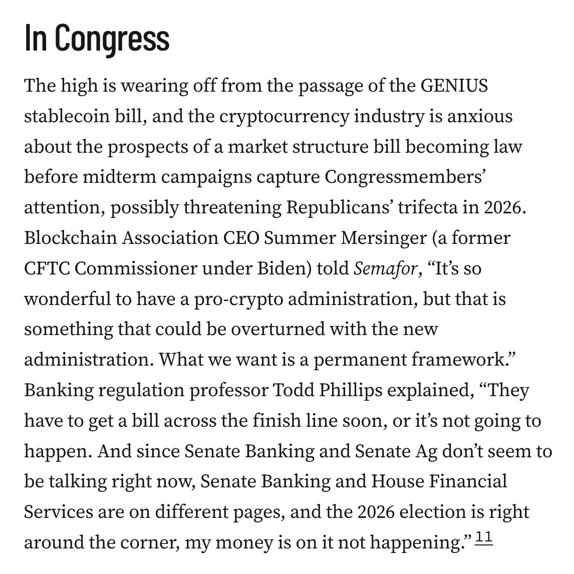 In Congress The high is wearing off from the passage of the GENIUS stablecoin bill, and the cryptocurrency industry is anxious about the prospects of a market structure bill becoming law before midterm campaigns capture Congressmembers’ attention, possibly threatening Republicans’ trifecta in 2026. Blockchain Association CEO Summer Mersinger (a former CFTC Commissioner under Biden) told Semafor, “It’s so wonderful to have a pro-crypto administration, but that is something that could be overturned with the new administration. What we want is a permanent framework.” Banking regulation professor Todd Phillips explained, “They have to get a bill across the finish line soon, or it’s not going to happen. And since Senate Banking and Senate Ag don’t seem to be talking right now, Senate Banking and House Financial Services are on different pages, and the 2026 election is right around the corner, my money is on it not happening.”11