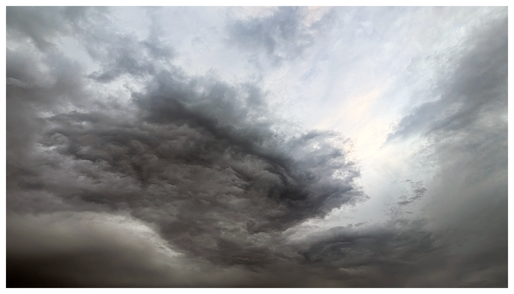 ai-assisted alt text: wide shot. dramatic sky with dense, swirling dark gray storm clouds dominating the scene; lighter patches of sky and soft sunlight peek through in the background.