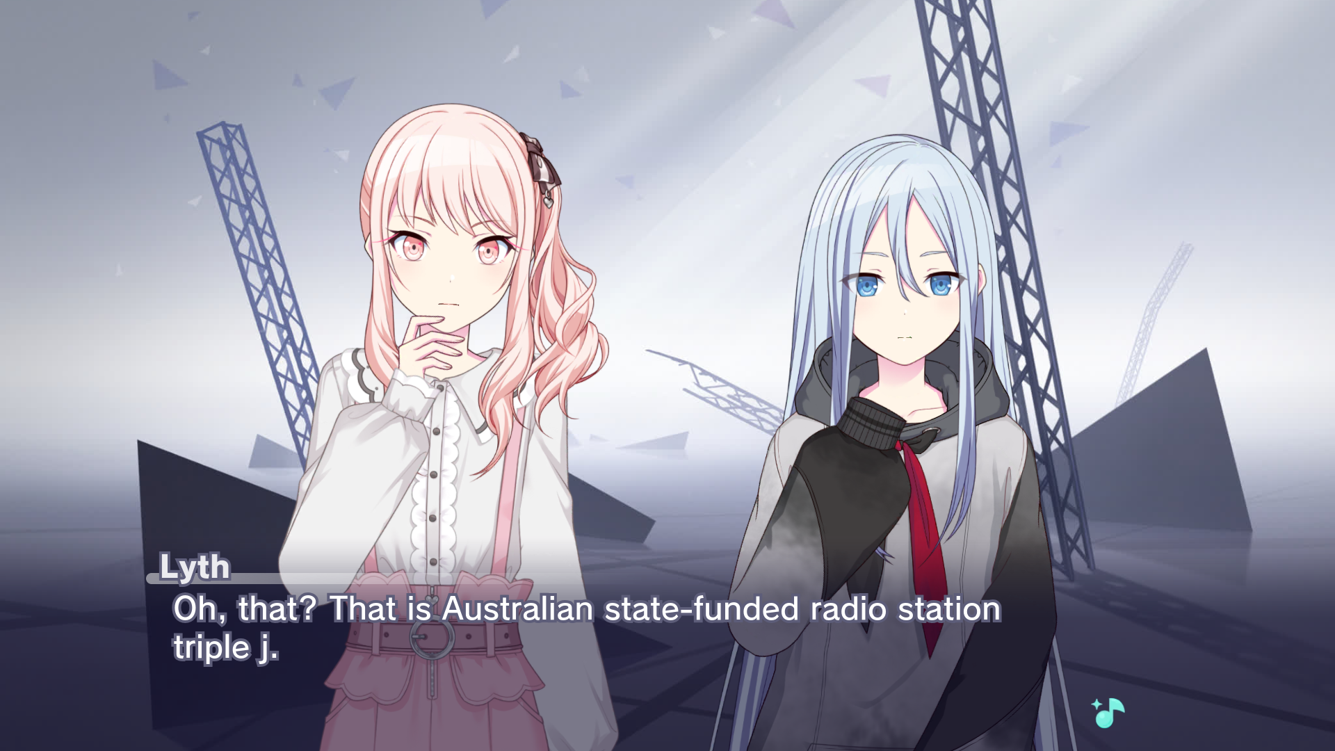 Lyth answers Mizuki's question with "Oh, that? That is Australian state-funded radio station triple j."