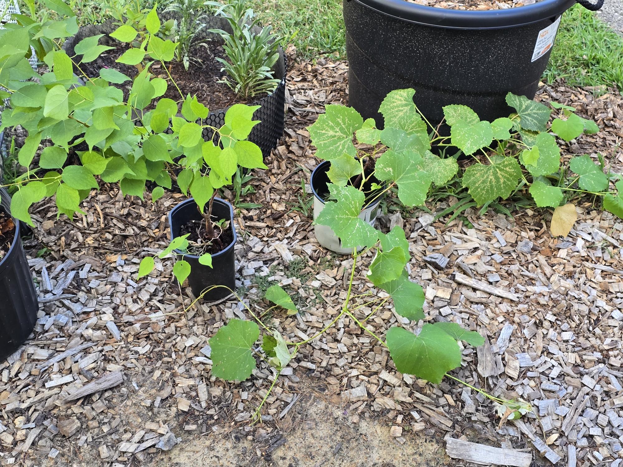 A Pixie-cot apricot tree and a cotton candy grape vine. There's a large black planter visible too.