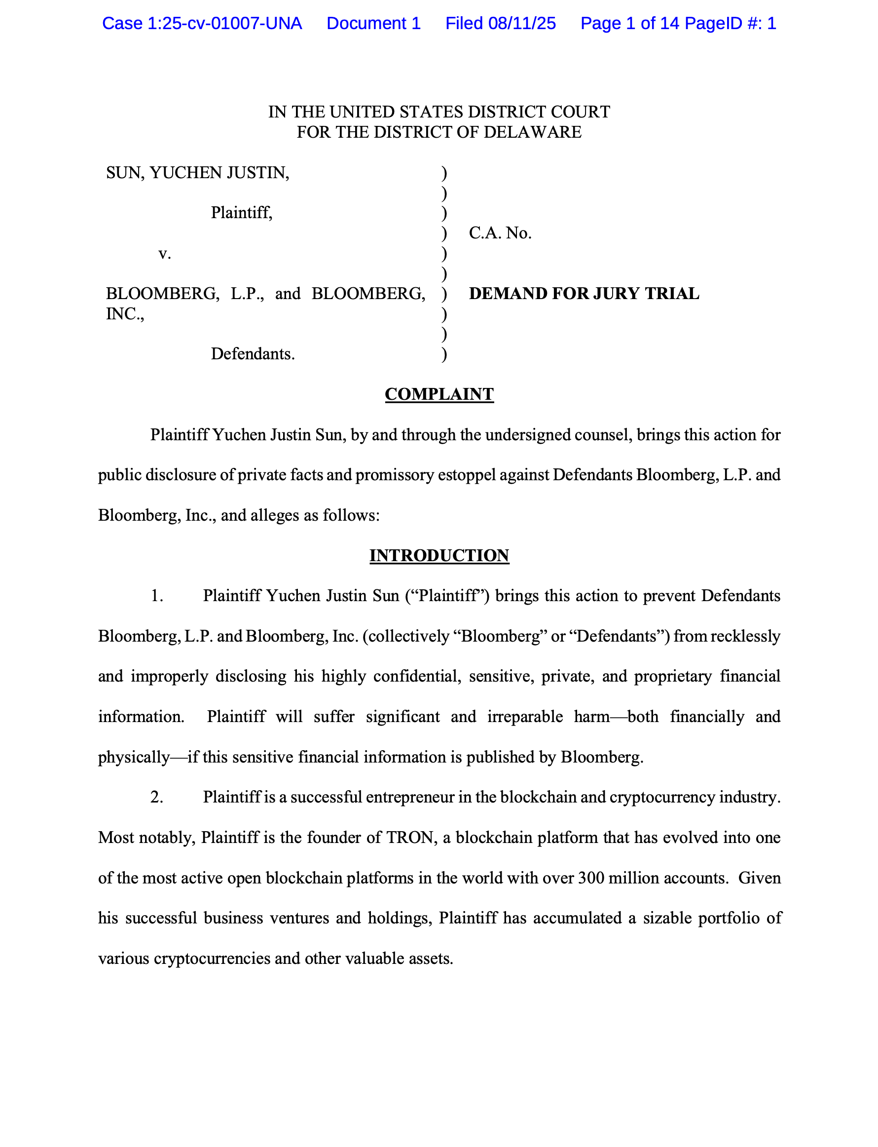 IN THE UNITED STATES DISTRICT COURT FOR THE DISTRICT OF DELAWARE SUN, YUCHEN JUSTIN, Plaintiff, v. BLOOMBERG, L.P., and BLOOMBERG, INC., Defendants. ) ) ) ) ) ) ) ) ) ) C.A. No. DEMAND FOR JURY TRIAL COMPLAINT Plaintiff Yuchen Justin Sun, by and through the undersigned counsel, brings this action for public disclosure of private facts and promissory estoppel against Defendants Bloomberg, L.P. and Bloomberg, Inc., and alleges as follows: INTRODUCTION 1. Plaintiff Yuchen Justin Sun (“Plaintiff”) brings this action to prevent Defendants Bloomberg, L.P. and Bloomberg, Inc. (collectively “Bloomberg” or “Defendants”) from recklessly and improperly disclosing his highly confidential, sensitive, private, and proprietary financial information. Plaintiff will suffer significant and irreparable harm—both financially and physically—if this sensitive financial information is published by Bloomberg. 2. Plaintiff is a successful entrepreneur in the blockchain and cryptocurrency industry. Most notably, Plaintiff is the founder of TRON, a blockchain platform that has evolved into one of the most active open blockchain platforms in the world with over 300 million accounts. Given his successful business ventures and holdings, Plaintiff has accumulated a sizable portfolio of various cryptocurrencies and other valuable assets.