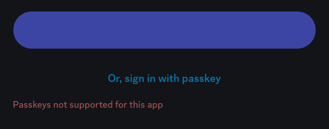 Discord login screen. The login button is blank. Beneath it, is a link to "Or sign in with passkey" Then, an error message in red says: Passkeys not supported for this app